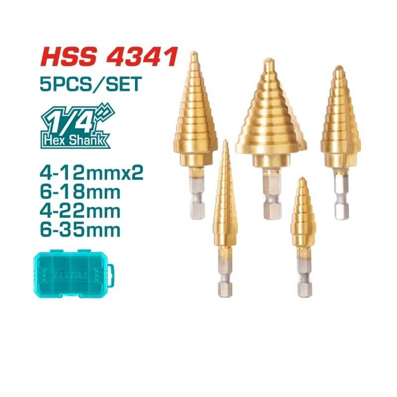 5 pcs Step drill bit set Material: HSS 4341 Packed by plastic box